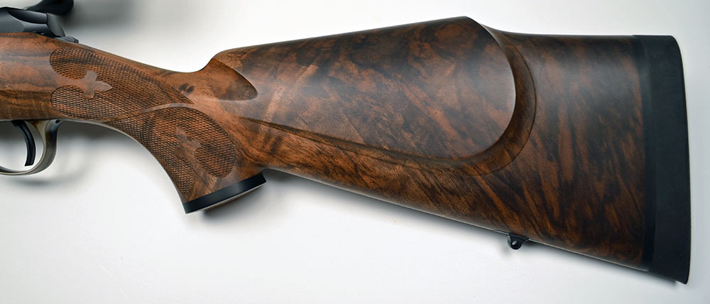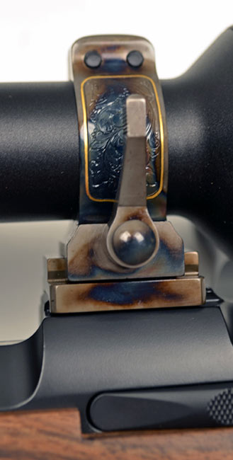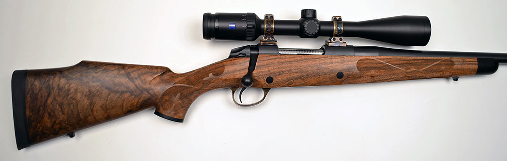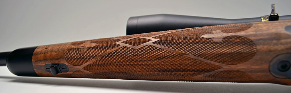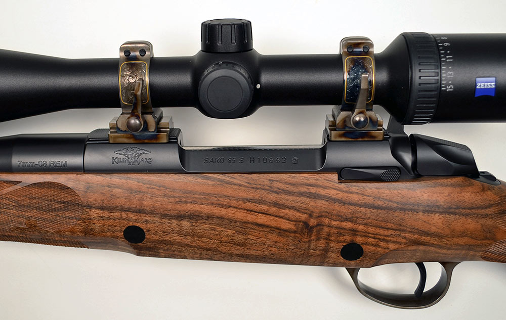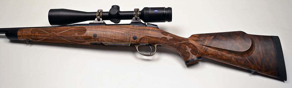 Trim and compact, and chambered for the 7mm-08 Rem. cartridge, this Walkabout Rifle features a Premier Grade Turkish Walnut stock, Stealth Lamination, Ebony wood accents including an Ebony ring with checkered walnut interior grip cap, and Diamond Fleur checkering. Built on the Sako 85S action, it features a 22.0" Douglas stainless barrel, sculpted Talley QD scope mounts, Kilimanjaro Black ceramic metal coating with color case hardened accents, and beautiful engraving with 24k gold inlay. LOP is 14.0" and trigger weight is 2.5 lbs. This rifle tested at 0.227" group at 100 yards with Barnes TSX 140g bullets and 40.0g of RL15 powder; and at 0.471" group with the same bullets and 47.0g of RL19 powder. Rifle comes with unengraved color-case hardened rings and magazine; engraved rings and magazine with 24k gold inlay as shown is $2,000 extra. Scope Not Included.